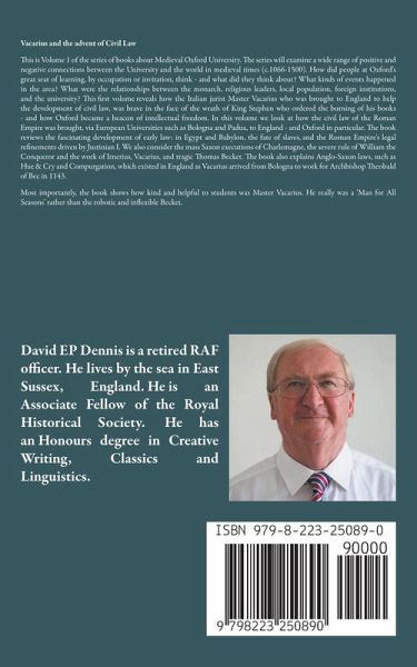 Vacarius and the advent of Civil Law This is Volume 1 of the series of books about Medieval Oxford University. The series will examine a wide range of positive and negative connections between the University and the world in medieval times (c.1066-1500). How did people at Oxford's great seat of learning, by occupation or invitation, think - and what did they think about? What kinds of events happened in the area? What were the relationships between the monarch, religious leaders, local population, foreign institutions, and the university? This first volume reveals how the Italian jurist Master Vacarius who was brought to England to help the development of civil law, was brave in the face of the wrath of King Stephen who ordered the burning of his books - and how Oxford became a beacon of intellectual freedom. In this volume we look at how the civil law of the Roman Empire was brought, via European Universities such as Bologna and Padua, to England - and Oxford in particular. The book reviews the fascinating development of early law: in Egypt and Babylon, the fate of slaves, and the Roman Empire's legal refinements driven by Justinian I. We also consider the mass Saxon executions of Charlemagne, the severe rule of William the Conqueror and the work of Irnerius, Vacarius, and tragic Thomas Becket. The book also explains Anglo-Saxon laws, such as Hue & Cry and Compurgation, which existed in England as Vacarius arrived from Bologna to work for Archbishop Theobald of Bec in 1143. Most importantly, the book shows how kind and helpful to students was Master Vacarius. He really was a 'Man for All Seasons' rather than the robotic and inflexible Becket.