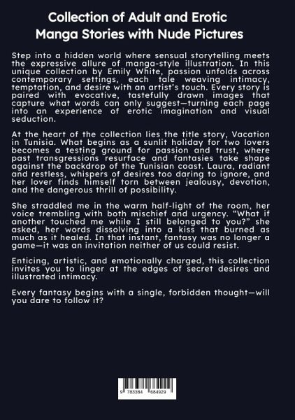 Step into a hidden world where sensual storytelling meets the expressive allure of manga-style illustration. In this unique collection by Emily White, passion unfolds across contemporary settings, each tale weaving intimacy, temptation, and desire with an artist's touch. Every story is paired with evocative, tastefully drawn images that capture what words can only suggest-turning each page into an experience of erotic imagination and visual seduction.At the heart of the collection lies the title story, Vacation in Tunisia. What begins as a sunlit holiday for two lovers becomes a testing ground for passion and trust, where past transgressions resurface and fantasies take shape against the backdrop of the Tunisian coast. Laura, radiant and restless, whispers of desires too daring to ignore, and her lover finds himself torn between jealousy, devotion, and the dangerous thrill of possibility.She straddled me in the warm half-light of the room, her voice trembling with both mischief and urgency. "What if another touched me while I still belonged to you?" she asked, her words dissolving into a kiss that burned as much as it healed. In that instant, fantasy was no longer a game-it was an invitation neither of us could resist.Enticing, artistic, and emotionally charged, this collection invites you to linger at the edges of secret desires and illustrated intimacy.Every fantasy begins with a single, forbidden thought-will you dare to follow it?