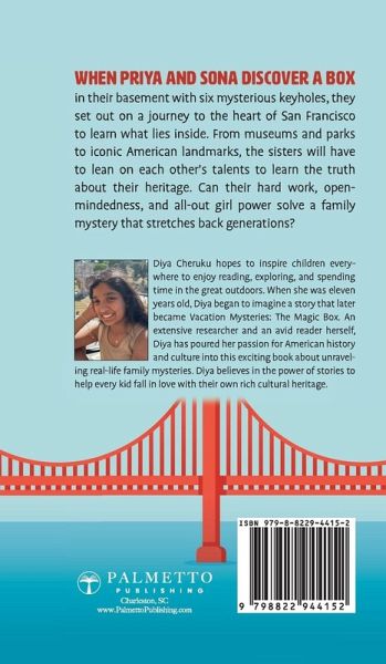 Embark on a journey to unlock ancient magic in this cultural adventure through the heart of San Francisco! Eleven-year-old Priya is an ordinary girl. She loves her family, she fights with her little sister, Sona, all the time . . . and she's crazy about everything to do with magic. When Priya and Sona discover an ancient box in their basement with six mysterious keyholes, they quickly realize they've stumbled across the mystery of a lifetime. After some clever internet sleuthing, the girls trace the box back to the city of San Francisco. Convincing their parents to take them on a family vacation is the easy part-now the real detective work begins. The sisters soon find themselves trekking across exciting locales, all in search of the keys to open the box. From museums and parks to iconic, cultural landmarks, Priya and Sona find themselves learning about art, American history, Native American culture, the importance of exercise, overcoming fears-and their own family legacy. With hard work, open-mindedness, and sheer girl power, can the girls unlock the truth behind a real-life family mystery? Vacation Mysteries: The Magic Box is written by young author Diya Cheruku. Envisioned when she was eleven years old herself, this story is the result of Diya's passionate research on cultures, locations, and her own heritage as an American immigrant. Diya hopes that kids like her will see themselves in Priya, and that her book will inspire them to fall in love with reading, exploration, and real-life adventures the same way she has.