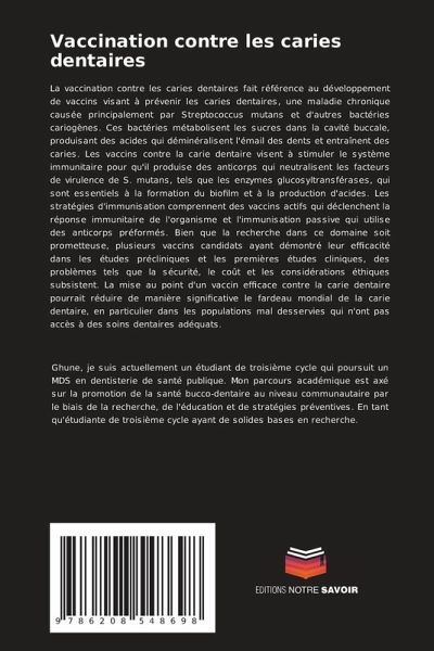 La vaccination contre les caries dentaires fait référence au développement de vaccins visant à prévenir les caries dentaires, une maladie chronique causée principalement par Streptococcus mutans et d'autres bactéries cariogènes. Ces bactéries métabolisent les sucres dans la cavité buccale, produisant des acides qui déminéralisent l'émail des dents et entraînent des caries. Les vaccins contre la carie dentaire visent à stimuler le système immunitaire pour qu'il produise des anticorps qui neutralisent les facteurs de virulence de S. mutans, tels que les enzymes glucosyltransférases, qui sont essentiels à la formation du biofilm et à la production d'acides. Les stratégies d'immunisation comprennent des vaccins actifs qui déclenchent la réponse immunitaire de l'organisme et l'immunisation passive qui utilise des anticorps préformés. Bien que la recherche dans ce domaine soit prometteuse, plusieurs vaccins candidats ayant démontré leur efficacité dans les études précliniques et les premières études cliniques, des problèmes tels que la sécurité, le coût et les considérations éthiques subsistent. La mise au point d'un vaccin efficace contre la carie dentaire pourrait réduire de manière significative le fardeau mondial de la carie dentaire, en particulier dans les populations mal desservies qui n'ont pas accès à des soins dentaires adéquats.