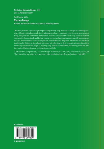 A Reverse Genetics Approach for the Design of Methyltransferase-Defective Live Attenuated Avian Metapneumovirus Vaccines.- Development of Fasciola Vaccine in an Animal Model.- Development of Experimental Vaccines against Liver Flukes.- Towards a Preventive Strategy for Toxoplasmosis: Current Trends, Challenges, and Future Perspectives for Vaccine Development.- DNA Vaccination in Chickens.- Selection of Vaccine Candidatesfor Fish Pasteurellosis Using a Reverse Vaccinology and an In Vitro Screening Approach.- Development of Vaccines against Nocardia in Fishes.- Design of an Immersion Vaccine against Aeromonad Septicaemia in Perch (Perca fluviatilis L.)..- Prokaryotic Production of Virus-Like Particle Vaccine of Betanodavirus.- Design and Construction of Shrimp Antiviral DNA Vaccines Expressing Long and Short Hairpins for Protection by RNA Interference.- Developing Anti-Tick Vaccines.- Host Immunization with Recombinant Proteins to Screen Antigens for Tick Control.- Vaccinomics Approach to Tick Vaccine Development.- Development of CpG ODN Based Vaccine Adjuvant Formulations.- Assembly and Assessment of DNA Scaffolded Vaccines.- Alphavirus-based Vaccines.- Vaccine Design: Replication-Defective Adenovirus Vectors.- Generation of Lymphocytic Choriomeningitis Virus based Vaccine Vectors.- Production of Japanese Encephalitis Virus-like Particles Using Insect Cell Expression Systems.- ;Subunit Protein Vaccine Delivery System for Tuberculosis Based on Hepatitis B Virus Core VLP (HBc-VLP) Particles.- Formulation Studies during Preclinical Development of Influenza Hemagglutinin and Virus-like Particle Vaccine Candidates.- Strategies for Vaccine Design using Phage Display-Derived Peptides.- Production of Well-Characterized Virus-Like Particles in an Escherichia coli based Expression Platform for Preclinical Vaccine Assessments.- Laboratory Scale Production of Recombinant Haa86 Tick Protein in Pichia pastoris and in Escherichia coli System.- E. Coli.- Immunoproteomic Approach for Screening Vaccine Candidates from Bacterial Outer Membrane Proteins.- Construction and Immunogenicity Testing of Whole Recombinant Yeast-Based T cell Vaccines.- Oral Rabies Vaccine Design For Expression in Plants.- Purification of Virus-like Particles (VLPs) from Plants.- Transient Expression of Viral Proteins in Plants using Agrobacterium tumefaciens.- A Plant-Based Transient Expression System for the Rapid Production of Malaria Vaccine Candidates.- Recombinant Botulinum Toxoids: A Practical Guide for Production.- Practical Approaches to Forced Degradation Studies of Vaccines.- Preparation of Multifunctional Liposomes as a Stable Vaccine Delivery-Adjuvant System by Procedure of Emulsification-Lyophilization.- Preparation of the Multifunctional Liposome-Containing Microneedle Arrays as an Oral Cavity Mucosal Vaccine Adjuvant-Delivery System.- Preparation and Characterization of PLGA Encapsulated Protective Antigen Domain 4 Nanoformulation.- Attenuated Salmonella sp. as a DNA delivery system for T. cruzi antigens.- Poly-e-Caprolactone/Chitosan and Chitosan Particles: Two Recombinant Antigen Delivery Systems for Intranasal Vaccination.- Micro-Fractional Epidermal Powder Delivery for Skin Vaccination.- A Bioinformatics Method for the Design of Live Attenuated Virus Vaccine Utilizing Host microRNA Response Elements.- The Web-based DNA Vaccine Database DNAVaxDB and its Usage for Rational DNA Vaccine Design.- MetaMHCpan, a Meta Approach for Pan-Specific MHC Peptide Binding Prediction.- A Cohesive and Integrated Platform for Immunogenicity Prediction.- The Regulatory Evaluation of Vaccines for Human Use.- Vaccines and IP Rights: A Multifaceted Relationship.- From the Bench to the Pharmacy: Protecting Innovation during Vaccine Development and Commercialization.- Intellectual Property in Vaccine Innovation: Impact of Recent Patent Developments