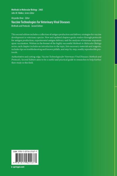 This second edition includes a collection of antigen production and delivery strategies for vaccine development in veterinary species. New and updated chapters guide readers through protocols for antigen production, experimental antigen delivery and the analysis of immune responses upon vaccination. Written in the format of the highly successful Methods in Molecular Biology series, each chapter includes an introduction to the topic, lists necessary materials and reagents, includes tips on troubleshooting and known pitfalls, and step-by-step, readily reproducible protocols. Authoritative and cutting-edge, Vaccine Technologies for Veterinary Viral Diseases: Methods and Protocols, Second Edition aims to be a useful and practical guide to researches to help further their study in this field.