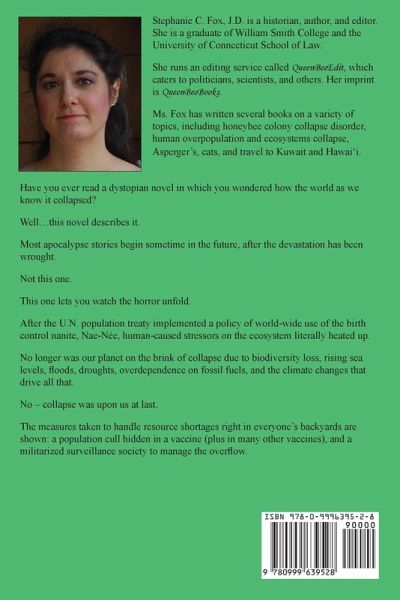 Have you ever read a dystopian novel in which you wondered how the world as we know it collapsed? Well...this novel explains that. Most apocalypse stories begin sometime in the future, after the devastation has been wrought. Not this one. This one lets you watch the horror unfold. After the U.N. population treaty implemented a policy of world-wide use of the birth control nanite, Nae-Née, human-caused stressors on the ecosystem literally heated up. No longer was our planet on the brink of collapse due to biodiversity loss, rising sea levels, floods, droughts, overdependence on fossil fuels, and the climate changes that drive all that. No - collapse was upon us at last. The measures taken to handle resource shortages right in everyone's backyards are shown: a population cull hidden in a vaccine (plus in many other vaccines), and a militarized surveillance society to manage the overflow.