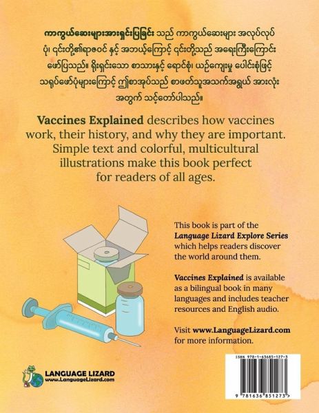 "This book is a great learning resource to help increase medical knowledge and decrease fear in all communities during a public health crisis." J. Basini MPH., Health Education Teacher Vaccines Explained describes how vaccines work, their history, and why they are important. Simple text and colorful, multicultural illustrations make this book perfect for readers of all ages. The book comes with audio, a lesson plan with extension activities, and resource links to support teaching in diverse classrooms. This book is available in English-only and in many bilingual editions. Vaccines Explained is part of the Language Lizard Explore Series which helps readers discover the world around them.
