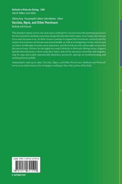 Poxvirus Epidemiology.- Mpox Specimen Collection, Storage, Preparation, and Laboratory Diagnostics by PCR.- A Quantitative Real-Time PCR Assay for Measuring Poxvirus Replication and Cell Binding.- Orthopoxvirus Genome Sequencing, Assembly, and Analysis.- Bioinformatics for the Structural Genomics of Poxviruses.- Construction and Isolation of Recombinant Vaccinia Virus by Homologous Recombination Using Fluorescent Protein Markers.- Rapid Generation of Recombinant Poxviruses Using CRISPR/Cas9 Gene Editing.- Cas9-Mediated Poxvirus Recombinant Recovery (CASPRR) for Fast Recovery of Recombinant Vaccinia Viruses.- Use of a Poxvirus K3 Ortholog as a Positive Selection Marker for Construction of Recombinant Vaccinia Virus with Modified Host Range.- Orthopoxvirus Purification for High Containment Laboratories.- Evaluation of Vaccinia Virus Infection in Mice Using Two-Reporter Recombinant Virus.- Bioluminescence Imaging to Study Recombinant Orthopoxvirus Infection in Animal Models.- Methods to Study Poxvirus Structures by Cryo-EM Imaging Modalities.- Investigating the Impact of Host Factors on Vaccinia Virus Infection through Single-Cell Analysis via Flow Cytometry.- High-Throughput Single Cell Analysis of Vaccinia Virus Infection.- Experimental Evolution of Poxviruses.- An Evolutionary Framework Exploiting Virologs and Their Host Origins to Inform Poxvirus Protein Functions.- Sample Preparation for Global Metabolic Profiling of Vaccinia Virus-Infected Primary Human Foreskin Fibroblasts.- Modified Vaccinia Virus Ankara Amplification and Titration Using Crystal Violet- or Immuno-Staining in DF-1 Cells.- Generating MVA-Vector Vaccine Candidates and Testing Them in Animal Models.- Isolation and Identification of Lumpy Skin Disease Virus.- Testing Oncolytic Myxoma Virus in Immunocompetent Mouse Model for Cancer Therapy.