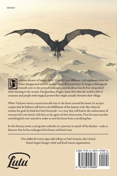 Everyone dreams of being a hero. Vaclyner is no different. Left orphaned when his father disappeared and his mother died a few years later, he longs to distinguish himself, even to the point of making up stories about foes he has vanquished while hunting in the woods. His guardian, Fragiir, warns him that the world is full of creatures and people with magical powers that might actually threaten their village. When Vaclyner meets a mysterious old man in the forest around his home, he accepts a quest that he believes will lead to the fulfillment of his dearest wish. But when he reaches his goal, he finds he's been betrayed-in a way that will lead to the enslavement of everyone he's ever loved, with him as the agent of their destruction. Now he must sacrifice everything he's ever wanted in order to save his home from a terrifying fate. In this fantasy novel, a young man embarks on a journey in search of his destiny-only to discover that he has endangered his home and loved ones.