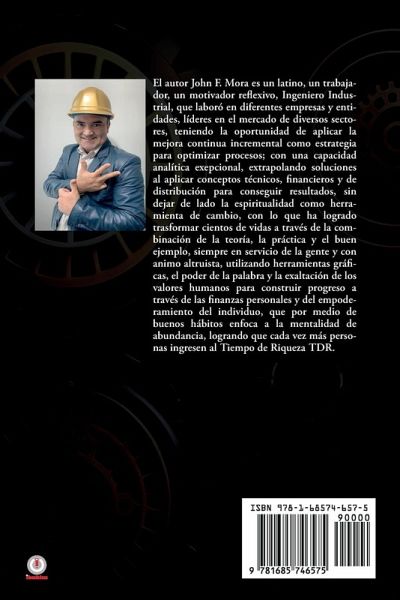 El autor John F. Mora es un latino, un trabajador, un motivador reflexivo, Ingeniero Industrial, que laboró en diferentes empresas y entidades, líderes en el mercado de diversos sectores, teniendo la oportunidad de aplicar la mejora continua incremental como estrategia para optimizar procesos; con una capacidad analítica excepcional, extrapolando soluciones al aplicar conceptos técnicos, financieros y de distribución para conseguir resultados, sin dejar de lado la espiritualidad como herramienta de cambio, con lo que ha logrado trasformar cientos de vidas a través de la combinación de la teoría, la práctica y el buen ejemplo, siempre en servicio de la gente y con animo altruista, utilizando herramientas gráficas, el poder de la palabra y la exaltación de los valores humanos para construir progreso a través de las finanzas personales y del empoderamiento del individuo, que por medio de buenos hábitos enfoca a la mentalidad de abundancia, logrando que cada vez más personas ingresen al Tiempo de Riqueza TDR.