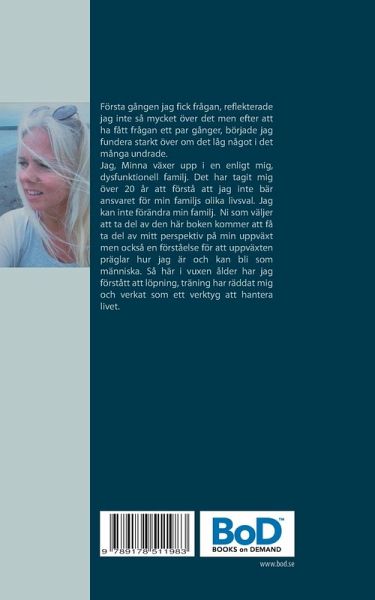 Första gången jag fick frågan, reflekterade jag inte så mycket över det men efter att ha fått frågan ett par gånger, började jag fundera starkt över om det låg något i det många undrade. Jag, Minna växer upp i en enligt mig, dysfunktionell familj. Det har tagit mig över 20 år att förstå att jag inte bär ansvaret för min familjs olika livsval. Jag kan inte förändra min familj. Ni som väljer att ta del av den här boken kommer att få ta del av mitt perspektiv på min uppväxt men också en förståelse för att uppväxten präglar hur jag är och kan bli som människa. Så här i vuxen ålder har jag förstått att löpning, träning har räddat mig och verkat som ett verktyg att hantera livet.