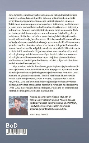 Kirja tarkastelee mallintavaa tietoutta useasta näkökulmasta kriittisesti, miten se ohjaa laajasti ihmisten valintoja ja käsitystä tietämisestä syrjäyttäen itsekokemuksellisuuden ja subjektiivisuuden elämässä. Tutkielman mukaan representaationaalinen tietäminen, mallintaminen ja laskeminen johtavat kokemuksellisuuden sivuuttamiseen tieteessä ja kulttuurissa. Ihminen luulee tietävänsä, mutta tutkii olematonta. Kirja on tiedon pirstaloitumisen ja sen seurauksena merkityksellisyyden ja sivistyksen häviämisen tutkielma osana laajaa yleistävää ajattelua tieteessä, kulttuurissa ja yhteiskunnassa. Kirja kuvaa teknillis-taloudellisen hyötyajattelun seurauksia historiassa ja ajassamme kaikkialle tunkevana ajattelun mallina. Se uhkaa esimerkiksi luontoa ja lopulta ihmisen olemassaoloa ulkoistavalla, subjektiivisen itsekoetun kieltävällä sekä samalla hävittävällä toiminnalla. Kirjan avaamissa tulevaisuuden näkymissä teknologinen apriori tiedostamaton ohjaa ihmistä ja kokemusta osana teknologista maailmassa olemisen tapaa. Se johtaa yleiseen ihmisen mallinnukseen ja tekoälyn robotiikkaan, mikä ei pohjaa enää ihmiseen itsekokemuksellisena subjektina. Kirja soveltuu kaikille filosofisesta, psykologisesta ja yhteiskunnallisesta ajattelusta kiinnostuneille lukijoille. Kirja pyrkii löytämään uusia ajattelu- ja toimintatapoja ihmisyyteen ajankohtaisissa teemoissa, jossa maailma on globaalissa kriisissä. Ilmiöitä käsitellään kiinnostavalla tavalla kulttuurin ja taiteen, kuten musiikin, kirjallisuuden ja elokuvan, avulla. Kirja pohjautuu fenomenologiseen ja psykoanalyyttiseen ajatteluun soveltaen ranskalaisen filosofin ja kirjailijan Michel Henryn (1922 - 2002) materiaalista fenomenologiaa. Tutkielma on ensimmäinen suomenkielinen johdatus hänen ajatteluunsa.