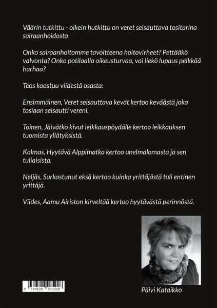 Väärin tutkittu - oikein hutkittu on veret seisauttava tositarina sairaanhoidosta, hoitovirheistä ja potilaan oikeuksista Onko sairaanhoitomme tavoitteena hoitovirheet? Pettääkö valvonta? Onko potilaalla oikeusturvaa, vai liekö lupaus pelkkää harhaa? Teos koostuu viidestä osasta: Ensimmäinen, Veret seisauttava kevät kertoo keväästä joka tosiaan seisautti vereni. Toinen, Jäivätkö kivut leikkauspöydälle kertoo leikkauksen tuomista yllätyksistä. Kolmas, Hyytävä Alppimatka kertoo unelmalomasta ja sen tuliaisista. Neljäs, Surkastunut eksä kertoo kuinka yrittäjästä tuli entinen yrittäjä. Viides, Aamu Airiston kirveltää kertoo hyytävästä perinnöstä.
