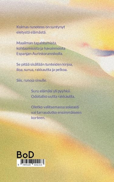 Kolmas runoteos on syntynyt eletystä elämästä. Maailman tapahtumista, kohtaamisista ja havainnoista Espanjan aurinkorannikolla. Se pitää sisällään tunteiden kirjoa, iloa, surua, rakkautta ja pelkoa. Siis, runoja sinulle. Suru elämäsi yli pyyhkii. Odotatko uutta rakkautta. Oletko valitsemassa sokeasti vai tarraudutko ensimmäiseen korteen.