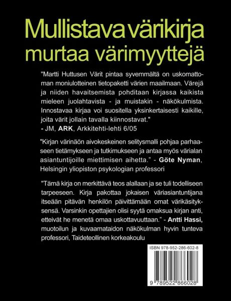 Martti Huttusen Värit pintaa syvemmältä on uskomattoman moniulotteinen tietopaketti värien maailmaan. Värejä ja niiden havaitsemista pohditaan kirjassa kaikista mieleen juolahtavista - ja muistakin - näkökulmista. Huttunen tarjoaa jokapäiväiseen havainnointiin ja tieteelliseen tutkimukseen tukeutuvaa tietoa sujuvasanaisesti ja ymmärrettävästi. Innostavaa kirjaa voi suositella yksinkerkertaisesti kaikille, joita värit jollain tavalla kiinnostavat - JM, ARK, Arkkitehti-lehti 6-2005 Kirjan värinäön aivokeskeinen selitysmalli pohjaa parhaaseen tietämykseen ja tutkimukseen ja antaa myös värialan asiantuntijoille miettimisen aihetta. - Göte Nyman, professori, Helsingin yliopisto Tämä kirja on merkittävä teos alallaan ja se tuli todelliseen tarpeeseen. Kirja pakottaa jokaisen väriasiantuntijana itseään pitävän henkilön päivittämään omat värikäsityksensä. Varsinkin opettajien olisi syytä omaksua kirjan anti, etteivät he menetä omaa uskottavuuttaan. - Antti Hassi, muotoilun ja kuvaamataidon näkökulman hyvin tunteva professori, Taideteollinen korkeakoulu (Aalto yliopisto) Kolmas täydennetty laitos