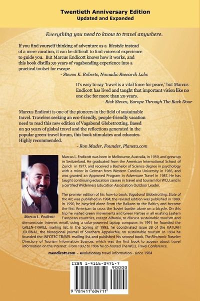 The definitive how-to book for world travel, Vagabond Globetrotting was first published in 1984 at the dawn of the information age. A second, updated edition appeared in 1989. Endicott's next book The Electronic Traveler introduced readers for the first time to the nascent travel resources available in the then largely unexplored cyberspace. This twentieth anniversary edition of Vagabond Globetrotting has been extensively revised and includes hundreds of essential web sites for travelers as well as indispensable tips, checklists, and resources.