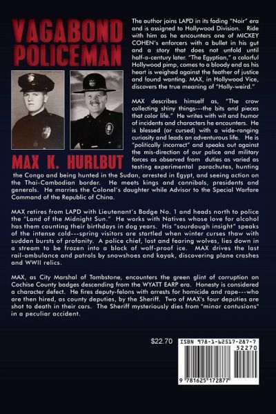 The author joins LAPD in the fading "Noir" era and is assigned to Hollywood. Ride with him as he encounters thugs, colorful pimps, and other characters in patrol & vice. MAX is "The crow collecting shiny things---the bits and pieces that color life." He writes with wit and humor of incidents and characters. MAX heads north to Alaska to police the Aleutian Chain, the Pribilofs, and Kodiak Island. He gives a "Sourdough's" insight into some peculiar happenings in the "Land of the Midnight Sun" as he patrols in kayak & snowshoes. He is called out of retirement to become City Marshal of Tombstone, Arizona, to find corruption and a department run amok. Two of his four deputies are shot to death. MAX travels the world as an Army Advisor. He tests experimental parachutes, is arrested in Egypt, pursued in The Sudan, hunts in the Congo, and sees action on the Thai/Cambodian border. He meets kings & presidents, generals & cannibals---and marries the Colonel's daughter in the Republic of China.