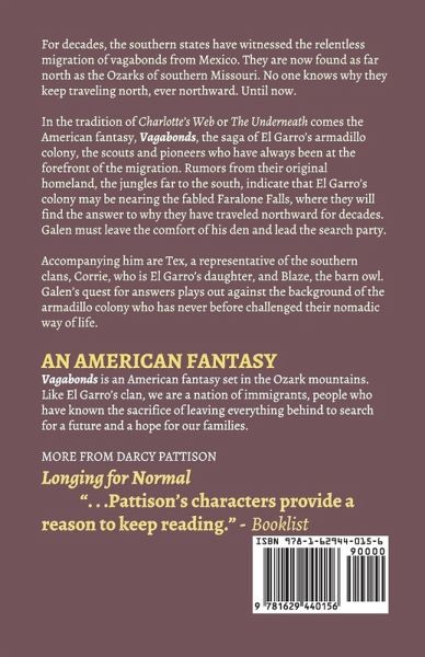 STRANGERS IN THE LAND Galen, the nine-banded armadillo, must accept the Tex, the ambitious outsider, as leader of the search for the fabled Faralone Falls, a place they can finally call home. But on the frontier, survival is the only thing that matters. Follow the armadillos on this epic quest for a home. An Epic Quest Across a Dangerous Frontier In the tradition of Warriors, Seekers, or The Guardins of Ga-Hoole comes the American fantasy, VAGABONDS, the sweeping saga of El Garro's armadillo colony, the scouts and pioneers who have always been at the forefront of the migration. Rumors from their original homeland, the jungles far to the south, suggest that El Garro's colony may be nearing the fabled Faralone Falls, where they will find the answer to why they have traveled northward for decades. On the frontier, the armadillos face the unknown. Each step, each decision is uncertain, full of dangers. Galen must find the courage to take the necessary steps, even though he fears the outcome. A Quest for a Home: An Immigrant's Tale VAGABONDS is an American fantasy set in the Ozark mountains. Like El Garro's clan, we are a nation of immigrants, people who have known the sacrifice of leaving everything behind in hopes of finding a future and a hope for their families. Your heart will ache for Galen as he must leave behind his Four sisters. You'll weep with him when he finds his brother, Rafael, who has been blinded--and yet, he sees. You'll marvel at the courage and compassion of these endearing vagabonds as they push the very boundaries of their world in search for a home. Travel for a season with Galen, Corrie, Victor, Blaze and Rafael. Experience the Ozark Mountains in all their glory - an American fantasy.This isn't a fast read; instead, it's a compelling read. Read Vagabonds and follow Galen as he grows into a leader among his people, one worthy of being remembered in ballads. WHY DID YOU WRITE THIS BOOK? Once upon a time there was a boy and girl who met in college at the U of A and they found they both enjoyed hiking in the Ozarks. It began a life long love of hiking.People say to write what you know: I was learning about camping and the Ozarks. One day, we went camping at the Steele Creek campground on the Buffalo River, and just at sunset, we saw armadillos digging in the bushes. I studied armadillos and found that they are an invasive species, coming up from Mexico into the U.S., and had already moved into the Ozarks of southern Missouri. Popular articles in newspapers at the time talked about how surprising it was that armadillos were able to withstand the cold as they moved north, but speculated that they were able to survive by digging deeper holes. Did you know that armadillos are the only creatures besides humans that have been known to contract leprosy? Did you know that armadillos are always born as quadruplets? All boys or all girls. Did you know that when startled armadillos jump straight up? It accounts for most of the road kill you see. Until finally, I knew enough to put them into a fictionalized story. Now, I wasn't writing what I knew, but what I imagined to be true. It seemed natural to make it an immigrant's story. These were creatures moving from South America, through Mexico, and into North America. Immigrants. I've always been fascinated with the difficulties faced by immigrants: leaving their home, crossing new lands, learning new languages.