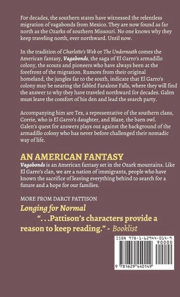 STRANGERS IN THE LAND Galen, the nine-banded armadillo, must accept the Tex, the ambitious outsider, as leader of the search for the fabled Faralone Falls, a place they can finally call home. But on the frontier, survival is the only thing that matters. Follow the armadillos on this epic quest for a home. An Epic Quest Across a Dangerous Frontier In the tradition of Warriors, Seekers, or The Guardins of Ga-Hoole comes the American fantasy, VAGABONDS, the sweeping saga of El Garro's armadillo colony, the scouts and pioneers who have always been at the forefront of the migration. Rumors from their original homeland, the jungles far to the south, suggest that El Garro's colony may be nearing the fabled Faralone Falls, where they will find the answer to why they have traveled northward for decades. On the frontier, the armadillos face the unknown. Each step, each decision is uncertain, full of dangers. Galen must find the courage to take the necessary steps, even though he fears the outcome. A Quest for a Home: An Immigrant's Tale VAGABONDS is an American fantasy set in the Ozark mountains. Like El Garro's clan, we are a nation of immigrants, people who have known the sacrifice of leaving everything behind in hopes of finding a future and a hope for their families. Your heart will ache for Galen as he must leave behind his Four sisters. You'll weep with him when he finds his brother, Rafael, who has been blinded--and yet, he sees. You'll marvel at the courage and compassion of these endearing vagabonds as they push the very boundaries of their world in search for a home. Travel for a season with Galen, Corrie, Victor, Blaze and Rafael. Experience the Ozark Mountains in all their glory - an American fantasy.This isn't a fast read; instead, it's a compelling read. Read Vagabonds and follow Galen as he grows into a leader among his people, one worthy of being remembered in ballads. WHY DID YOU WRITE THIS BOOK? Once upon a time there was a boy and girl who met in college at the U of A and they found they both enjoyed hiking in the Ozarks. It began a life long love of hiking.People say to write what you know: I was learning about camping and the Ozarks. One day, we went camping at the Steele Creek campground on the Buffalo River, and just at sunset, we saw armadillos digging in the bushes. I studied armadillos and found that they are an invasive species, coming up from Mexico into the U.S., and had already moved into the Ozarks of southern Missouri. Popular articles in newspapers at the time talked about how surprising it was that armadillos were able to withstand the cold as they moved north, but speculated that they were able to survive by digging deeper holes. Did you know that armadillos are the only creatures besides humans that have been known to contract leprosy? Did you know that armadillos are always born as quadruplets? All boys or all girls. Did you know that when startled armadillos jump straight up? It accounts for most of the road kill you see. Until finally, I knew enough to put them into a fictionalized story. Now, I wasn't writing what I knew, but what I imagined to be true. It seemed natural to make it an immigrant's story. These were creatures moving from South America, through Mexico, and into North America. Immigrants. I've always been fascinated with the difficulties faced by immigrants: leaving their home, crossing new lands, learning new languages.