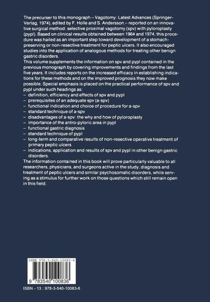 The preceding monograph: ''Vagotomy - latest advances", Springer-Verlag, 1974 ed. by F. Holle and S. Andersson reported an innovation in surgery: the so-called "selective proximal vago tomy (spv) with pyloroplasty (pypl)". The usefulness of the method was put to the test in cases of peptic ulcer disease and in dog experiments. No claim was made - as some reviewers erroneously supposed - that the method was a comprehensive presentation of the surgery of peptic ulcer disease or even that it offered a patent solution to this subject Instead, it should be regarded as the initial step towards this goal. The clinical results obtained during the years 1964-74 encouraged us to pursue this line of approach with a view of reaching a stomachpreserving or non-resective method in peptic ulcer surgery and to test the appli cability of the method to other benign disorders of the stomach. After 16 years of testing and experience with over 2000 cases S (Dec. 1t. 1979) of selective proximal vagotomy with pyloroplasty, supplemented by advanced studies on the pathophysiology of the method, an additional volume is now proposed: "Vagotomy and Pyloroplasty, advances 1975-1980", Springer-Verlag 1980. This subsequent volume deals primarily with improvements and findings made during the last 5 years. It also refers to important questions concerning the practical performance of the method which arose from congresses and discussions in this field. These are: 1. Definition, efficiency and effects of the model: spv + pypl. 2.