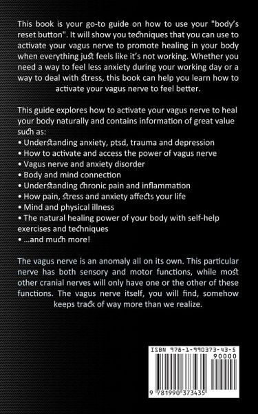 This book is your go-to guide on how to use your "body's reset button". It will show you techniques that you can use to activate your vagus nerve to promote healing in your body when everything just feels like it's not working. Whether you need a way to feel less anxiety during your working day or a way to deal with stress, this book can help you learn how to activate your vagus nerve to feel better. This guide explores how to activate your vagus nerve to heal your body naturally and contains information of great value such as: ¿ Understanding anxiety, ptsd, trauma and depression ¿ How to activate and access the power of vagus nerve ¿ Vagus nerve and anxiety disorder ¿ Body and mind connection ¿ Understanding chronic pain and inflammation ¿ How pain, stress and anxiety affects your life ¿ Mind and physical illness ¿ The natural healing power of your body with self-help exercises and techniques ¿ ...and much more! The vagus nerve is an anomaly all on its own. This particular nerve has both sensory and motor functions, while most other cranial nerves will only have one or the other of these functions. The vagus nerve itself, you will find, somehow keeps track of way more than we realize.