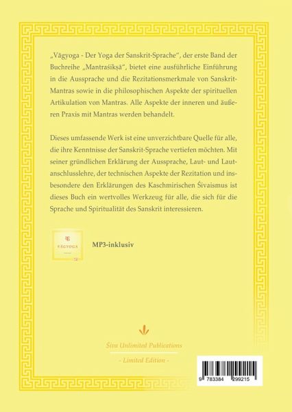 "Vagyoga - Der Yoga der Sanskrit-Sprache", der Schlüsselband der Buchreihe "Mantrasiksa", bietet eine ausführliche Einführung in die Aussprache und Rezitationsmerkmale von Sanskrit-Mantras sowie in die philosophischen Aspekte der spirituellen Artikulation von Mantras. Alle Aspekte der inneren und äußeren Praxis mit Mantras werden behandelt. Dieses umfassende Werk ist eine unverzichtbare Quelle für alle, die ihre Kenntnisse der Sanskrit-Sprache vertiefen möchten. Mit seiner gründlichen Erklärung der Aussprache, Laut- und Lautanschlusslehre, der technischen Aspekte der Rezitation und insbesondere den Erklärungen des Kaschmirischen Sivaismus ist dieses Buch ein wertvolles Werkzeug für alle, die sich für die Sprache und Spiritualität des Sanskrit interessieren. Die Mantrasiksa Buchreihe beinhaltet Übungen zum Trainieren des Bewusstseins, so wie der alte Yoga Indiens es vorsah, Verehrungsformeln (Mantras), ebenso wie den Verehrungsvorgang (Puja) als eine Sammlung besonders schöner undwirkungsvoller Sanskrit-Literatur. "Vagyoga" bildet den Auftakt der Buchreihe, die zugleich eine Hörbuch-Reihe ist, da alle Mantras und Übungen mit MP3s hinterlegt sind.