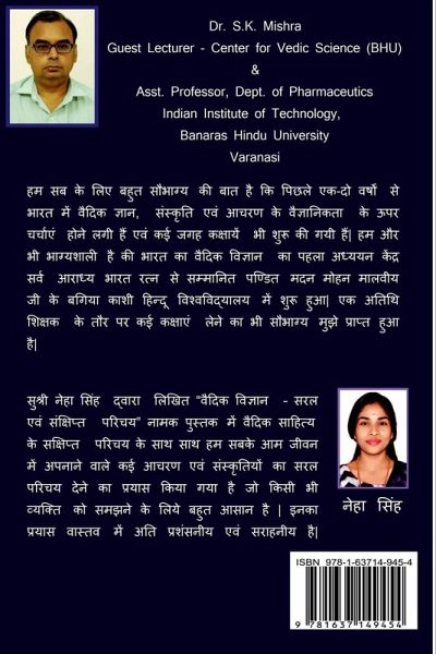 It is a matter of great luck for all of us that discussions have been started in India over the last one or two years on the scientificity of Vedic knowledge, culture and conduct and in many places classes have also been started. We are even more fortunate that the first study center of Vedic science of India started at Banaras Hindu University founded by Pandit Madan Mohan Malaviya ji, who was an awarded of Bharat Ratna. I have also had the privilege of taking several classes as a guest teacher in the Vedic Science Department. Ms. Neha Singh is one of the meritorious students of the first session of Vedic Science Center of Kashi Hindu University, Varanasi, who continuously tried to learn more and more in a short time and to study her Vedic science intensively like a penance. She has taken admission in Vedic Science after graduating from fine arts, having so much interest in reading and knowing. Interest in Vedic science subject has been seen very rarely in today's youngsters. In the book titled 'Vedic Science' - Simple and Brief Introduction"" written by Ms. Neha Singh, along with a brief introduction to Vedic literature, she has tried to give a simple introduction to the many practices and cultures that we all adopt in our common life and is very easy to understand. Her efforts are indeed very much appreciated.