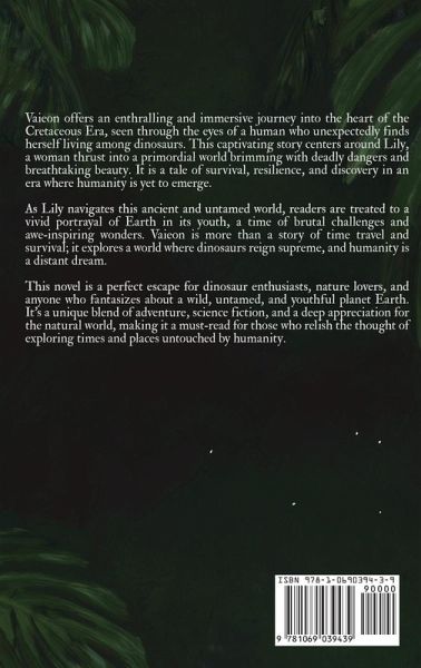 Vaieon offers an enthralling and immersive journey into the heart of the Cretaceous Era, seen through the eyes of a human who unexpectedly finds herself living among dinosaurs. This captivating story centers around Lily, a woman thrust into a primordial world brimming with deadly dangers and breathtaking beauty. It is a tale of survival, resilience, and discovery in an era where humanity is yet to emerge.As Lily navigates this ancient and untamed world, readers are treated to a vivid portrayal of Earth in its youth, a time of brutal challenges and awe-inspiring wonders. Vaieon is more than a story of time travel and survival; it explores a world where dinosaurs reign supreme and humanity is a distant dream.This novel is a perfect escape for dinosaur enthusiasts, nature lovers, and anyone who fantasizes about a wild, untamed, and youthful planet Earth. It's a unique blend of adventure, science fiction, and a deep appreciation for the natural world, making it a must-read for those who relish the thought of exploring times and places untouched by humanity.