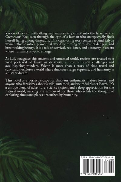 Vaieon offers an enthralling and immersive journey into the heart of the Cretaceous Era, seen through the eyes of a human who unexpectedly finds herself living among dinosaurs. This captivating story centers around Lily, a woman thrust into a primordial world brimming with deadly dangers and breathtaking beauty. It is a tale of survival, resilience, and discovery in an era where humanity is yet to emerge.As Lily navigates this ancient and untamed world, readers are treated to a vivid portrayal of Earth in its youth, a time of brutal challenges and awe-inspiring wonders. Vaieon is more than a story of time travel and survival; it explores a world where dinosaurs reign supreme and humanity is a distant dream.This novel is a perfect escape for dinosaur enthusiasts, nature lovers, and anyone who fantasizes about a wild, untamed, and youthful planet Earth. It's a unique blend of adventure, science fiction, and a deep appreciation for the natural world, making it a must-read for those who relish the thought of exploring times and places untouched by humanity.