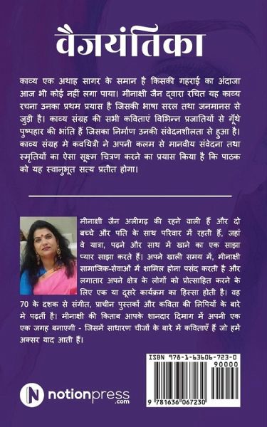 Poetry is like a bottomless ocean, whose depths no one has been able to estimate even today. This poetic work composed by Meenakshi Jain is her first attempt Vaijayantika, whose language is simple and connected to the public. All the poems in the poetic collection are like wreaths from different species which have been created by their sensitivity. In the poetry collection, the poet has tried to make such a subtle depiction of human sensations and memories with her pen that the reader will find this self-evident truth.