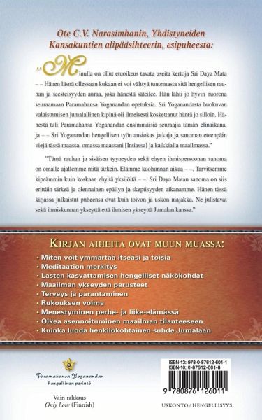Ote C.V. Narasimhanin, Yhdistyneiden Kansakuntien alipääsihteerin, esipuheesta: "Minulla on ollut etuoikeus tavata useita kertoja Sri Daya Mata - - Hänen läsnä ollessaan kukaan ei voi välttyä tuntemasta sitä hengellisen rauhan ja seesteisyyden auraa, joka hänestä säteilee. Hän lähti jo hyvin nuorena seuraamaan Paramahansa Yoganandan opetuksia. Sri Yoganandasta huokuvan valaistumisen jumalallinen kipinä oli ilmeisesti koskettanut häntä jo silloin. Hänestä tuli Paramahansa Yoganandan ensimmäisiä seuraajia tämän elinaikana, ja - - Sri Yoganandan hengellisen työn ansiokas jatkaja ja sanoman eteenpäin viejä tässä maassa, omassa maassani [Intiassa] ja kaikkialla maailmassa." "Tämä rauhan ja sisäisen tyyneyden sekä ehyen ihmispersoonan sanoma on omalle ajallemme mitä tärkein. Elämme kuohunnan aikaa - -. Tarvitsemme kipeämmin kuin koskaan ehyitä yksilöitä - -. Sri Daya Matan sanoma on siis erittäin tärkeä ja olennainen epäilyn ja skeptisyyden aikanamme. Hänen tässä kirjassa julkaistut puheensa ovat kuin toivon ja uskon majakka. Ne julistavat sekä ihmiskunnan ykseyttä että ihmisen ykseyttä Jumalan kanssa." Kirjan aiheita ovat muun muassa: * Miten voit ymmärtää itseäsi ja toisia * Meditaation merkitys * Lasten kasvattamisen hengelliset näkökohdat * Maailman ykseyden perusteet * Terveys ja parantaminen * Rukouksen voima * Menestyminen perhe- ja liike-elämässä * Oikea asennoituminen maailman tilanteeseen * Kuinka luoda henkilökohtainen suhde Jumalaan