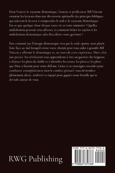 Dans Vaincre le royaume démoniaque, l'auteur et prédicateur Bill Vincent emmène les lecteurs dans une découverte spirituelle des principes bibliques qui aideront le lecteur à comprendre le mal et le royaume démoniaque. Est-ce que quelque chose bloque votre vie et votre ministère ? Quelles malédictions peuvent vous affecter, et comment briser les esprits et les malédictions démoniaques afin d'accélérer votre guérison ? Être consumé par l'énergie démoniaque n'est pas la seule option, mais plutôt faire face au mal lorsqu'il croise votre chemin peut vous aider à grandir. Bill Vincent a affronté le démoniaque et, au cours de cette expérience, Dieu a fait une percée. Ses révélations vous apprendront à être un guerrier du Seigneur, à déjouer les plans du diable et à identifier les armes, les plans et les plans que Dieu a fournis pour votre défense. Grâce à ces stratégies cruciales pour combattre triomphalement dans le combat spirituel, vous deviendrez pleinement alerte, renforcé et équipé pour gagner toute bataille qui se déroule autour de vous.