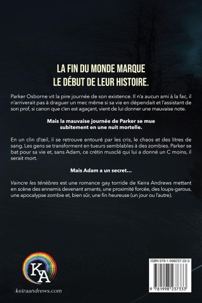 La fin du monde marque le début de leur histoire. Parker Osborne vit la pire journée de son existence. Il n'a aucun ami à la fac, il n'arriverait pas à draguer un mec même si sa vie en dépendait et l'assistant de son prof, si canon que c'en est agaçant, vient de lui donner une mauvaise note. Mais la mauvaise journée de Parker se mue subitement en une nuit mortelle. En un clin d'¿il, il se retrouve entouré par les cris, le chaos et des litres de sang. Les gens se transforment en tueurs semblables à des zombies. Parker se bat pour sa vie et, sans Adam, ce crétin musclé qui lui a donné un C moins, il serait mort. Mais Adam a un secret... Vaincre les ténèbres est une romance gay torride de Keira Andrews mettant en scène des ennemis devenant amants, une proximité forcée, des loups-garous, une apocalypse zombie et, bien sûr, une fin heureuse (un jour ou l'autre).