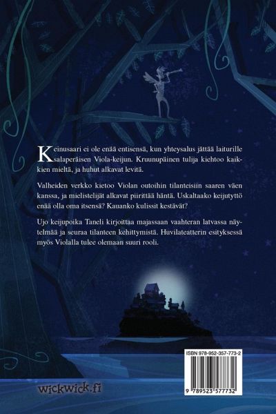 Swing Island is no longer what it used to be when on one drizzly morning a colony vessel drops off a mysterious fairy called Viola at the pier. Wearing a crown, the new arrival fascinates everyone.The net of lies ensnares Viola in curious encounters with the island folk, and flatterers start encircling her. Does the fairy girl dare to be herself anymore? Can she keep up the facade?From the lookout post up in a tree, a shy fairy boy called Daniel observes how things evolve, while writing a script for a play. In the Villa Theater, Viola will have a big role to play. ---Keinusaari ei ole enää entisensä, kun yhteysalus jättää laiturille salaperäisen Viola-keijun. Kruunupäinen tulija kiehtoo kaikkien mieltä, ja huhut alkavat levitä.Valheiden verkko kietoo Violan outoihin tilanteisiin saaren väen kanssa, ja mielistelijät alkavat piirittää häntä. Uskaltaako keijutyttö enää olla oma itsensä? Kauanko kulissit kestävät?Ujo keijupoika Taneli kirjoittaa majassaan vaahteran latvassa näytelmää ja seuraa tilanteen kehittymistä. Huvilateatterin esityksessä myös Violalla tulee olemaan suuri rooli.