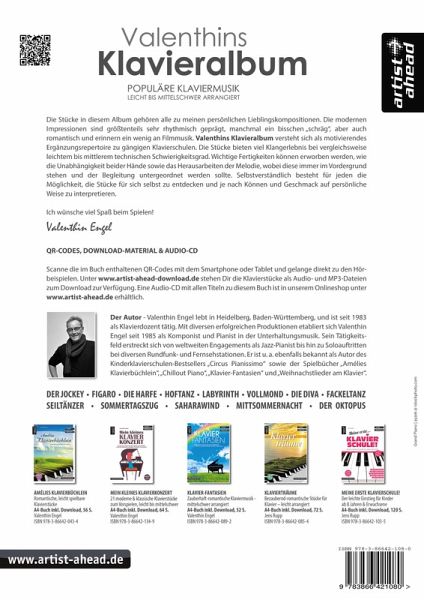 Scanne die im Buch enthaltenen QR-Codes mit dem Smartphone oder Tablet und gelange direkt zu den Hörbeispielen. Unter artist-ahead-download.de stehen Dir die enthaltenen Klavierstücke als Audio- und MP3-Dateien zum Download zur Verfügung. Eine Audio-CD mit allen Titeln zu diesem Buch ist in unserem Onlineshop unter artist-ahead.de erhältlich.