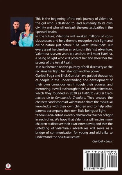 This is the beginning of the epic journey of Valentina, the girl who is destined to lead humanity to its own divinity and who will unleash the greatest battles in the Spiritual Realm. In the future, Valentina will awaken millions of consciousnesses and help them to recognize their light and divine nature just before "The Great Revolution". But every great heroine has an origin. In this first adventure, Valentina is seven years old and she will meet Estelina, a being of light who will protect her and show her the secrets of the Astral Realm. Join our heroine on this journey of self-discovery as she reclaims her light, her strength and her power. Claribel Puga and Erick Gurrola have guided thousands of people in the understanding and development of their own consciousness through their courses and mentoring, as well as through their Ascendant Institute, which they founded in 2020 as Instituto Para el Creci- miento de la Consciencia Creadora. They created the character and stories of Valentina to share their spiritual knowledge with their own children and to help other parents accompany their own little beings of light. "There is a Valentina in every child and a teacher of light in each of us. We hope that Valentina will inspire many children to discover their own inner power, and that the unfolding of Valentina's adventures will serve as a bridge of communication for young and old alike to understand the Spiritual Realm". Claribel y Erick.