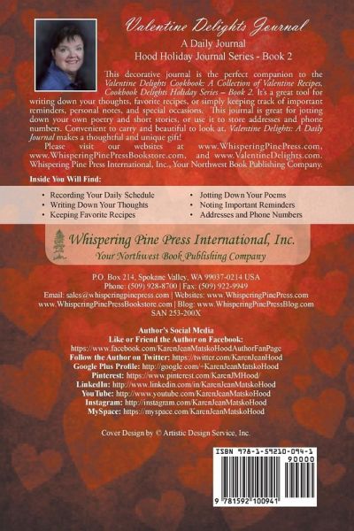This decorative journal is the perfect companion to the Valentine Delights Cookbook: A Collection of Valentine Recipes, Cookbook Delights Series. It's a great tool for writing down your thoughts, favorite recipes, or simply keeping track of important reminders, personal notes, and special occasions. Each turn of the page reveals fresh food for thought, such as inspiring poetry and words of enlightenment. The pages are also sprinkled with fun trivia about Valentine's Day history and folklore and symbols of this special day. This journal is great for jotting down your own poetry and short stories, or use it to store addresses and phone numbers. Convenient to carry and beautiful to look at, Valentine Delights Journal makes a thoughtful and unique gift!