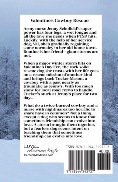 Army nurse Jenny Schofield's super power has four legs, a wet tongue and all the love she needs when PTSD hits. Luckily, with the help of her service dog, Val, she's gradually regaining some normalcy in her old home town. Routine is her friend-giant storms are not. When a major winter storm hits on Valentine's Day Eve, the rock solid rescue dog she trusts with her life goes on a rescue mission of another kind-and brings back Tucker Mason, a cowboy with a past nearly as traumatic as Jenny's. With too much snow for local road crews to handle, Tucker's stuck at Jenny's place for two days. What do a twice-burned cowboy and a nurse with nightmares too horrific to share have in common? Not a thing, except a dog who seems to know that sometimes friendship can evolve into love. A storm brought them together, but a fearless dog seems intent on teaching them that sometimes friendship can evolve into love.