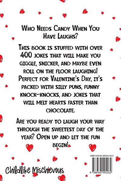 Get ready for giggles, grins, and a whole lot of heartwarming fun! Valentine's Day Jokes for Kids is the ultimate laugh-out-loud book packed with over 400 hilarious jokes, riddles, and knock-knocks - perfect for boys, girls, and the whole family. From silly puns and sweet treats to lovable animals and classroom-friendly jokes, this book has something for everyone! Whether you're making Valentine's cards, having a class exchange, or just sharing smiles at home, these clean and funny jokes will keep kids laughing and families smiling all season long. Why You'll Love This Book: Perfect for Kids: Clean, family-friendly jokes that children can easily share with friends, siblings, and classmates. Packed with Themes: Love, friendship, family, food, animals, and magical Valentine's fun. Great for Gifting: Makes a fantastic Valentine's gift, classroom prize, or party favor. Fun for Everyone: Short and simple jokes that bring laughter and joy to every moment. Make this Valentine's Day extra special with laughter, love, and smiles - the sweetest treat of all!