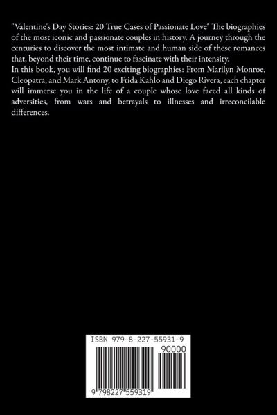Dear reader: Have you ever wondered what makes some love stories transcend time and become legends? In "Valentine's Day Stories: 20 True Cases of Passionate Love," you will discover the biographies of the most emblematic and passionate couples in history. This book will take you on a journey through the centuries, to discover the most intimate and human side of these romances that, beyond their time, continue to fascinate with their intensity, their displays of affection, and, in many cases, their tragic outcomes. What will you find in this book? 20 passionate biographies: From Marilyn Monroe, Cleopatra, and Mark Antony, to Frida Kahlo and Diego Rivera, each chapter will immerse you in the life of a couple whose love faced all kinds of adversities, from wars and betrayals to illnesses and irreconcilable differences. Who They Were and How They Met: You'll learn the details of their first encounters, how love arose between them, and how their unique personalities influenced the intensity of their relationships. Displays of Affection and Gestures of Passion: From ardent love letters to monumental sacrifices, these romances knew no bounds. Each couple showed their love in ways that still inspire us today. Misfortunes and Heartbreaks: Passionate love can also be heartbreaking. You'll discover the moments of pain and tragedies that often marked the fate of these couples, but at the same time made their stories immortal. This book is not only a testament to the great loves that have endured throughout history but also a reflection on human nature and how love can be such a powerful force that it can even defy time. "Valentine's Day Stories: 20 True Stories of Passionate Love" is the perfect gift for hopeless romantics, history buffs, and those who believe that love, with all its lights and shadows, is the most powerful feeling in the world. Delve into these unforgettable stories and let yourself be carried away by the romance, passion, and drama that only true love can inspire. Get your copy today and relive the most passionate loves of all time.