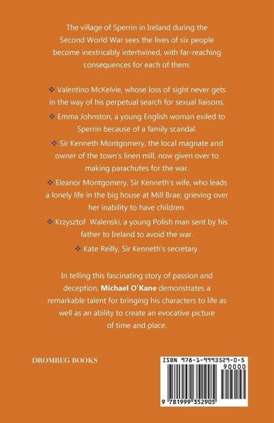 The village of Sperrin in Ireland during the Second World War sees the lives of six people become inextricably intertwined, with far-reaching consequences for each of them: — Valentino McKelvie, whose loss of sight does not hinder his perpetual search for sexual liaisons. — Emma Johnston, a young English woman exiled to Sperrin because of a family scandal. — Sir Kenneth Montgomery, the local magnate and owner of the town’s linen mill, now given over to making parachutes for the war. — Eleanor Montgomery, Sir Kenneth’s wife, who leads a lonely life in the big house at Mill Brae, grieving over her inability to have children. — Kryzsztof Walenski, a young Polish man sent by his father to Ireland to avoid the war. — Kate Reilly, Sir Kenneth’s secretary. In telling this fascinating story of passion and deception, Michael O’Kane demonstrates a remarkable talent for bringing his characters to life as well as an ability to create an evocative picture of time and place.
