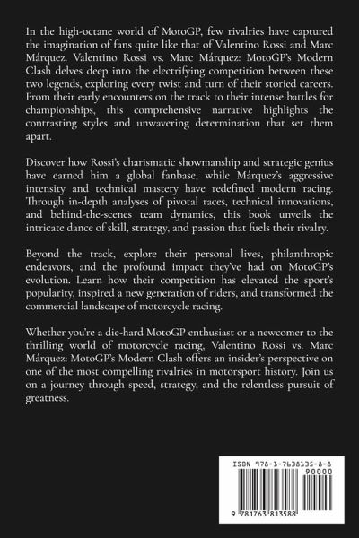 In the high-octane world of MotoGP, few rivalries have captured the imagination of fans quite like that of Valentino Rossi and Marc Márquez. Valentino Rossi vs. Marc Márquez: MotoGP's Modern Clash delves deep into the electrifying competition between these two legends, exploring every twist and turn of their storied careers. From their early encounters on the track to their intense battles for championships, this comprehensive narrative highlights the contrasting styles and unwavering determination that set them apart. Discover how Rossi's charismatic showmanship and strategic genius have earned him a global fanbase, while Márquez's aggressive intensity and technical mastery have redefined modern racing. Through in-depth analyses of pivotal races, technical innovations, and behind-the-scenes team dynamics, this book unveils the intricate dance of skill, strategy, and passion that fuels their rivalry. Beyond the track, explore their personal lives, philanthropic endeavors, and the profound impact they've had on MotoGP's evolution. Learn how their competition has elevated the sport's popularity, inspired a new generation of riders, and transformed the commercial landscape of motorcycle racing. Whether you're a die-hard MotoGP enthusiast or a newcomer to the thrilling world of motorcycle racing, Valentino Rossi vs. Marc Márquez: MotoGP's Modern Clash offers an insider's perspective on one of the most compelling rivalries in motorsport history. Join us on a journey through speed, strategy, and the relentless pursuit of greatness.