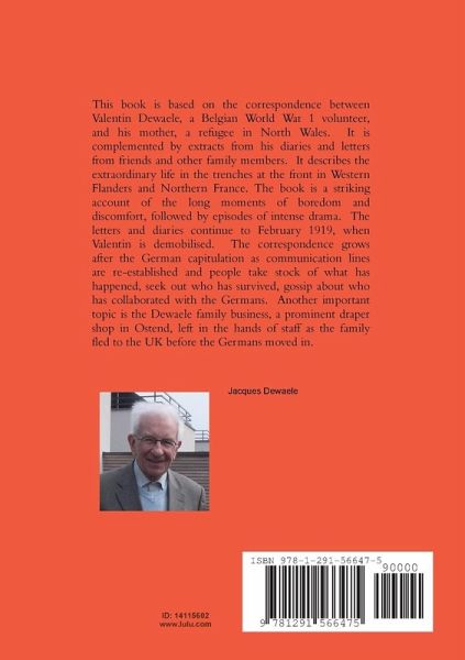 This book is based on the correspondence between Valentin Dewaele, a Belgian First World War volunteer, and his mother, a refugee in North Wales. It is complemented by extracts from his diaries and letters from friends and other family members. It describes the extraordinary life in the trenches at the front in Western Flanders and Northern France. It a striking account of the long moments of boredom and discomfort, followed by episodes of intense drama. The letters and diaries continue to February 1919, when Valentin is demobilised. The correspondence with family and friends grows after the German capitulation as communication lines are re-established and people take stock of what has happened, seek out who has survived, gossip about who has collaborated with the Germans. Another important topic is the Dewaele family business, a prominent draper shop in Ostend, left in the hands of staff as the family fled to the UK before the Germans moved in.