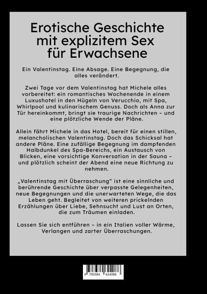 Ein Valentinstag. Eine Absage. Eine Begegnung, die alles verändert.Zwei Tage vor dem Valentinstag hat Michele alles vorbereitet: ein romantisches Wochenende in einem Luxushotel in den Hügeln von Verucchio, mit Spa, Whirlpool und kulinarischem Genuss. Doch als Anna zur Tür hereinkommt, bringt sie traurige Nachrichten - und eine plötzliche Wende der Pläne.Allein fährt Michele in das Hotel, bereit für einen stillen, melancholischen Valentinstag. Doch das Schicksal hat andere Pläne. Eine zufällige Begegnung im dampfenden Halbdunkel des Spa-Bereichs, ein Austausch von Blicken, eine vorsichtige Konversation in der Sauna - und plötzlich scheint der Abend eine neue Richtung zu nehmen."Valentinstag mit Überraschung" ist eine sinnliche und berührende Geschichte über verpasste Gelegenheiten, neue Begegnungen und die unerwarteten Wege, die das Leben geht. Begleitet von weiteren prickelnden Erzählungen über Liebe, Sehnsucht und Lust an Orten, die zum Träumen einladen.Lassen Sie sich entführen- in ein Italien voller Wärme, Verlangen und zarter Überraschungen.