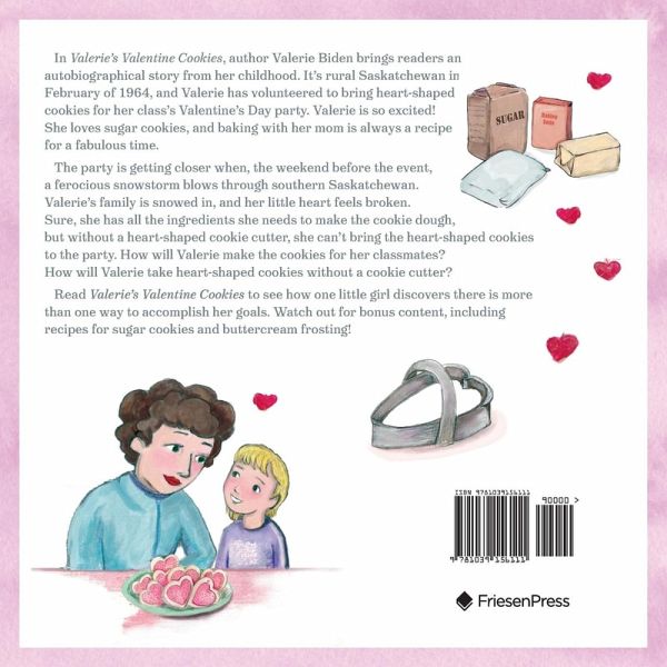 In Valerie's Valentine Cookies, author Valerie Biden brings readers an autobiographical story from her childhood. It's rural Saskatchewan in February of 1964, and Valerie has volunteered to bring heart-shaped cookies for her class's Valentine's Day party. Valerie is so excited! She loves sugar cookies, and baking with her mom is always a recipe for a fabulous time. The party is getting closer when, the weekend before the event, a ferocious snowstorm blows through southern Saskatchewan. Valerie's family is snowed in, and her little heart feels broken. Sure, she has all the ingredients she needs to make the cookie dough, but without a heart-shaped cookie cutter, she can't bring the heart shaped cookies to the party. How will Valerie make the cookies for her classmates? How will Valerie take heart-shaped cookies without a cookie cutter? Read Valerie's Valentine Cookies to see how one little girl discovers there is more than one way to accomplish her goals. Watch out for bonus content, including recipes for sugar cookies and buttercream frosting!