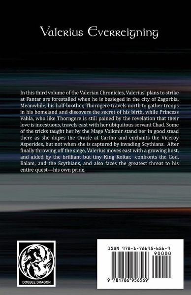 In this third volume of the Valerian Chronicles, Valerius' plans to strike at Fantar are forestalled when he is besieged in the city of Zagorbia. Meanwhile, his half-brother, Thorngere travels north to gather troops in his homeland and discovers the secret of his birth, while Princess Vahla, who like Thorngere is still pained by the revelation that their love is incestuous, travels east with her ubiquitous servant Chad. Some of the tricks taught her by the Mage Volkmir stand her in good stead there as she dupes the Oracle at Cartho and enchants the Viceroy Asperides, but not when she is captured by invading Scythians. After finally throwing off the siege, Valerius moves east with a growing host, and aided by the brilliant but tiny King Koltar, confronts the God, Balam, and the Scythians, and also faces the greatest threat to his entire quest-his own pride.