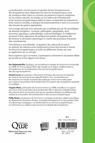 La biodiversité joue de nombreux rôles, à la fois source et produit du bon fonctionnement des écosystèmes dont dépendent les services écosystémiques. Dans un contexte de pressions toujours croissantes sur les milieux naturels, les études sur les valeurs de la biodiversité et les services écosystémiques aident à mieux comprendre les interactions entre nature et sociétés, à anticiper les bouleversements à venir et à concevoir des mesures de gestion appropriées. Cet ouvrage découle d'un séminaire qui a mobilisé plus de 40 scientifiques issus d'une grande diversité de disciplines: écologie, philosophie, géographie, droit, économie, génétique, anthropologie, sciences politiques. Il a fidèlement conservé la libre expression de perspectives parfois divergentes afin de restituer la dimension dynamique et vivante des processus d'avancée des connaissances. Trois thèmes y sont abordés: la question des valeurs de la nature en général, les relations entre biodiversité et bien-être humain à travers les services écosystémiques, et enfin les différentes formes d'opérationnalisation de ce concept. Nous espérons qu'à sa mesure, il participera à alimenter le nécessaire débat de société sur notre rapport à la nature.