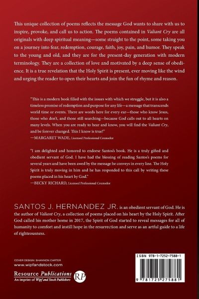 Santos J. Hernandez Jr., the author of Valiant Cry (2020) and Truth, Love, Light, and Salt (2021), is a poet and writer who writes about the complexities of the temporal and spiritual nature of the heart. As a survivor of many spiritual battles, he shares his stories of obedience, redemption, grace, and mercy in his writing, his art, and his life. Once a lost and turmoiled soul, he is now a disciple of Jesus, actively engaged.