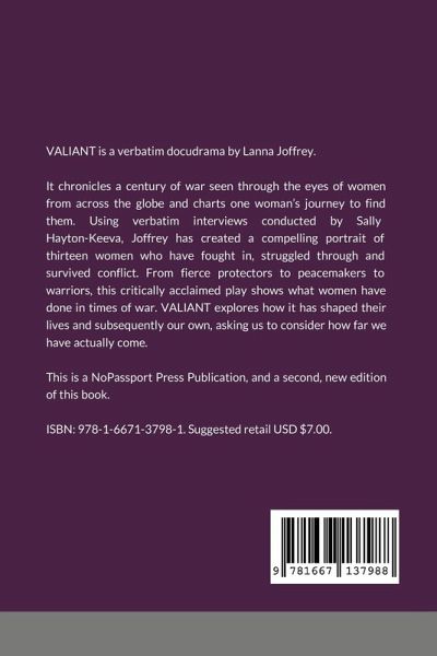VALIANT is a play by Lanna Joffrey. It chronicles a century of war as seen through the eyes of women from across the globe and it also charts one woman's journey to find them. Based on verbatim interviews conducted by Sally Hayton-Keeva, the play asks us to meet thirteen women who have fought in and struggled through and survived conflict. This play paints a compelling portrait of what women do in times of war, and how they survive. It asks its audience to consider as well how far we've come in understanding each other, and if history's lessons have taught us anything toward building a more equitable, peacekeeping world. This is a NoPassport Press publication, and a second, new edition of this book. ISBN: 978-1-6671-3798-8. USD retail: $7.00.