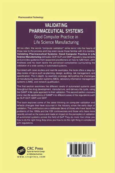 This highly readable text offers a pragmatic approach to the validation of automated/computerized systems, an essential core task when establishing and maintaining compliance with global regulatory authorities, such as the FDA and the MHRA. It examines the different levels of automated systems used throughout the drug development, manufacture, and delivery life cycle, using the GAMP-4 life cycle approach to their validation. Rich with case studies and real-life examples, it also supplies the reader with true applications of GAMP 4 to different areas of regulations, such as good laboratory practice, good clinical practice, good manufacturing practice, and good data practice.