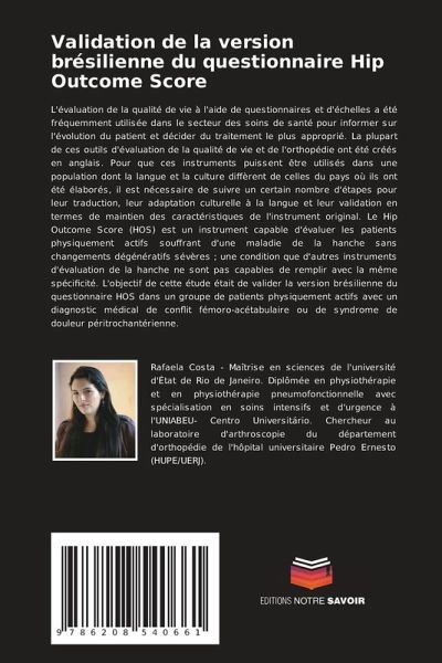 L'évaluation de la qualité de vie à l'aide de questionnaires et d'échelles a été fréquemment utilisée dans le secteur des soins de santé pour informer sur l'évolution du patient et décider du traitement le plus approprié. La plupart de ces outils d'évaluation de la qualité de vie et de l'orthopédie ont été créés en anglais. Pour que ces instruments puissent être utilisés dans une population dont la langue et la culture diffèrent de celles du pays où ils ont été élaborés, il est nécessaire de suivre un certain nombre d'étapes pour leur traduction, leur adaptation culturelle à la langue et leur validation en termes de maintien des caractéristiques de l'instrument original. Le Hip Outcome Score (HOS) est un instrument capable d'évaluer les patients physiquement actifs souffrant d'une maladie de la hanche sans changements dégénératifs sévères ; une condition que d'autres instruments d'évaluation de la hanche ne sont pas capables de remplir avec la même spécificité. L'objectif de cette étude était de valider la version brésilienne du questionnaire HOS dans un groupe de patients physiquement actifs avec un diagnostic médical de conflit fémoro-acétabulaire ou de syndrome de douleur péritrochantérienne.