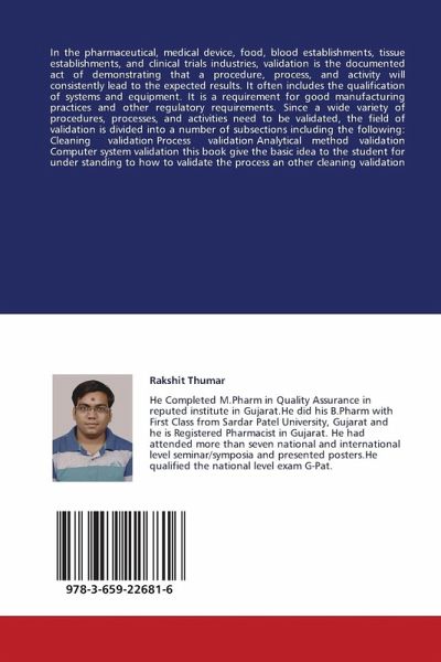 In the pharmaceutical, medical device, food, blood establishments, tissue establishments, and clinical trials industries, validation is the documented act of demonstrating that a procedure, process, and activity will consistently lead to the expected results. It often includes the qualification of systems and equipment. It is a requirement for good manufacturing practices and other regulatory requirements. Since a wide variety of procedures, processes, and activities need to be validated, the field of validation is divided into a number of subsections including the following: Cleaning validation Process validation Analytical method validation Computer system validation this book give the basic idea to the student for under standing to how to validate the process an other cleaning validation