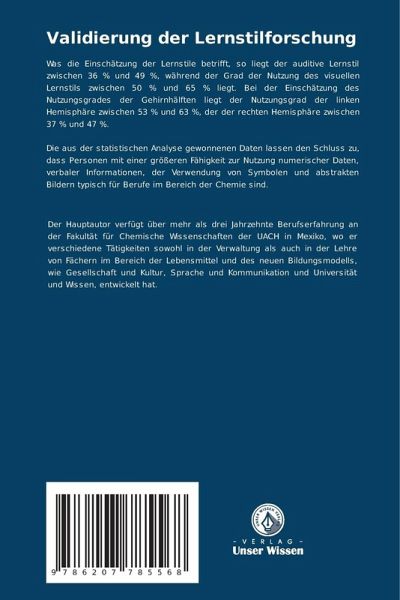 Was die Einschätzung der Lernstile betrifft, so liegt der auditive Lernstil zwischen 36 % und 49 %, während der Grad der Nutzung des visuellen Lernstils zwischen 50 % und 65 % liegt. Bei der Einschätzung des Nutzungsgrades der Gehirnhälften liegt der Nutzungsgrad der linken Hemisphäre zwischen 53 % und 63 %, der der rechten Hemisphäre zwischen 37 % und 47 %.Die aus der statistischen Analyse gewonnenen Daten lassen den Schluss zu, dass Personen mit einer größeren Fähigkeit zur Nutzung numerischer Daten, verbaler Informationen, der Verwendung von Symbolen und abstrakten Bildern typisch für Berufe im Bereich der Chemie sind.